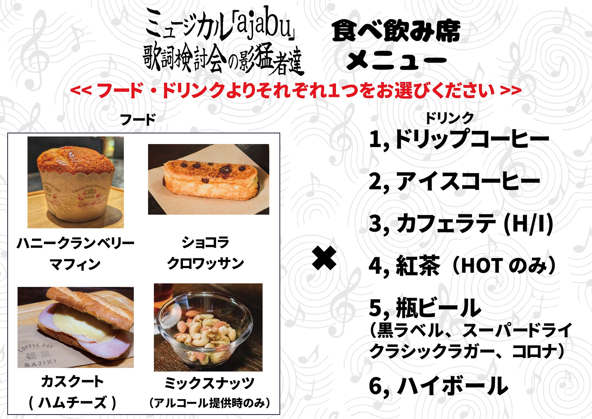 食べ飲み席のドリンクとフードは下記メニューからお好きなものをお選びいただけます!